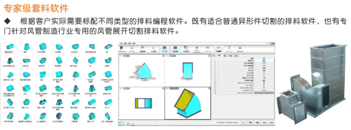 1、厚壁方管整體焊接,人工時效床體,堅固、不變形、剛性好。2、主要針對通風工程行業設計,大幅面,滿足大型風管展開下料,配備專業的風機風管行業鈑金展開軟件。運行速度快,免去繁瑣的人工計算及手工勞動。